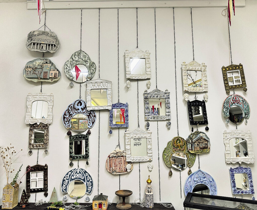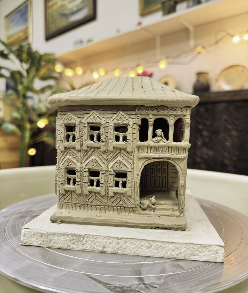 Анастасия тоже не отстает от мужа. Именно она придумала визитную карточку мастерской – «деревянную» Вологду в керамике. Всем известно, что город славится своим деревянным зодчеством: резные палисады украшают исторический центр и по сей день. Поэтому девушка решила увековечить здания в глине и создала маленькие копии миниатюрных домов и даже вологодских храмов. Домики полые внутри, туда можно поместить гирлянду или свечу, и появится ощущение, что в домиках горит свет. Особенно цепляет декор – каждый наличник вылеплен вручную, на крыльце сидит котенок, а на подоконнике – ваза с цветами. Вологжан впечатлила и сама идея, и ее исполнение, поэтому ребята стали организовывать выставки своих керамических изделий.