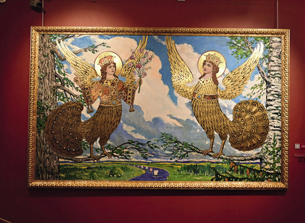 Одна из первых монументальных работ (именно так называются эти картины на сайте галереи) – «Мистерия XX века» – была написана в 1977 году. Тогда власти запретили ее показывать из-за присутствия на ней портрета Солженицына в телогрейке. Его предложили заменить на Брежнева, но автор отказался это сделать. Сейчас в галерее выставлена доработанная в 1999 году картина размером 3 на 8 метров. На ней можно увидеть десятки исторических персонажей, политиков, музыкантов, писателей, а по углам – автопортреты художника с разницей в 22 года. Вверху картины изображен парящий Христос, а правее – зародыш. Это XXI век, он связан с уходящим «кровавым» столетием пуповиной в виде колючей проволоки… И таких образов и аллегорий в картинах Глазунова можно увидеть много.