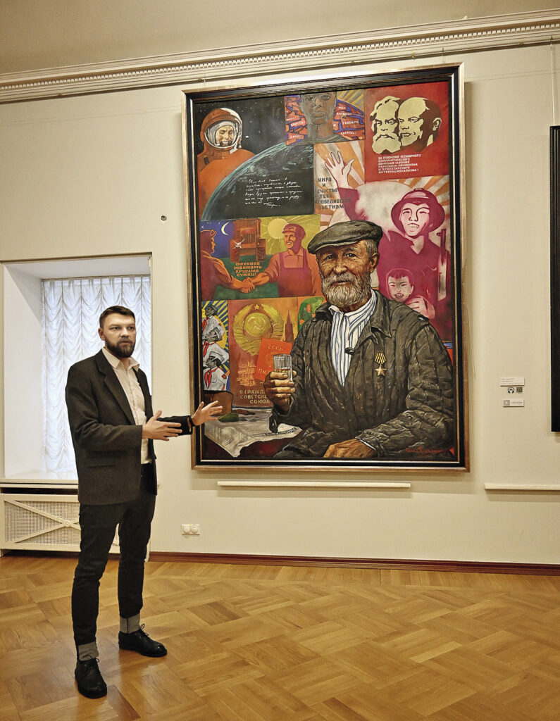 Родившись в 1930 году в Ленинграде, во время блокады он потерял всю семью. Родные погибли, а он выжил – мальчишку вывезли из города по Дороге жизни. Воспитывал его дядя, академик медицины. В галерее есть его портрет, а также первые студенческие работы Глазунова, кстати, очень высокого уровня. Уже будучи студентом ленинградского Института живописи, скульптуры и архитектуры имени И.Е. Репина, в 1957 году он победил в международном художественном конкурсе в Праге. За это он получает возможность организовать в Москве, в Центральном доме работников искусств, свою первую персональную выставку, на которой демонстрирует 80 работ. Выставка производит фурор – на нее приходят тысячи человек, даже привлекают конную милицию для порядка, приезжает министр культуры, выходят публикации в печати, в том числе за рубежом. Поскольку картины Глазунова выходили за пределы продвигаемого властью соцреализма, выставку быстро закрыли, а художника чуть не отчислили из института. Из-за этого события для него на долгие годы был закрыт путь в Союз художников, за дипломную работу ему поставили тройку и отправили по распределению учителем черчения в Ижевск, а затем в Иваново.