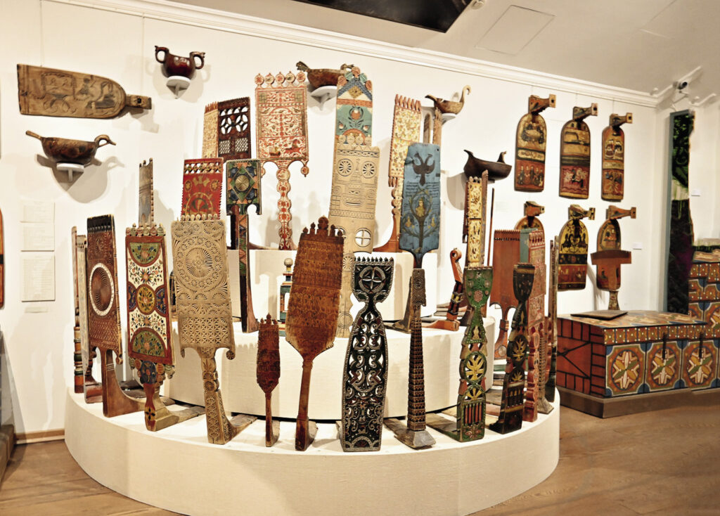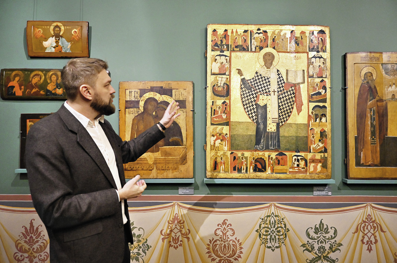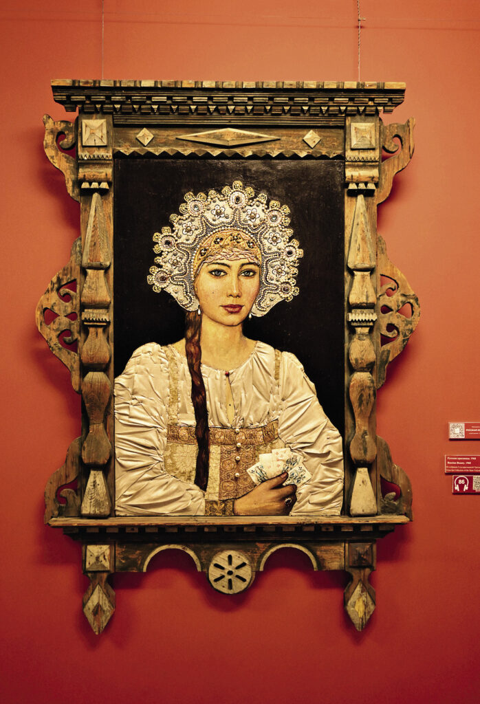 Для икон мастеров московской Оружейной палаты Илья Глазунов создал красивый зал в стиле XVII– XVIII веков. Всевозможные старинные прялки в отделе крестьянство. ФО