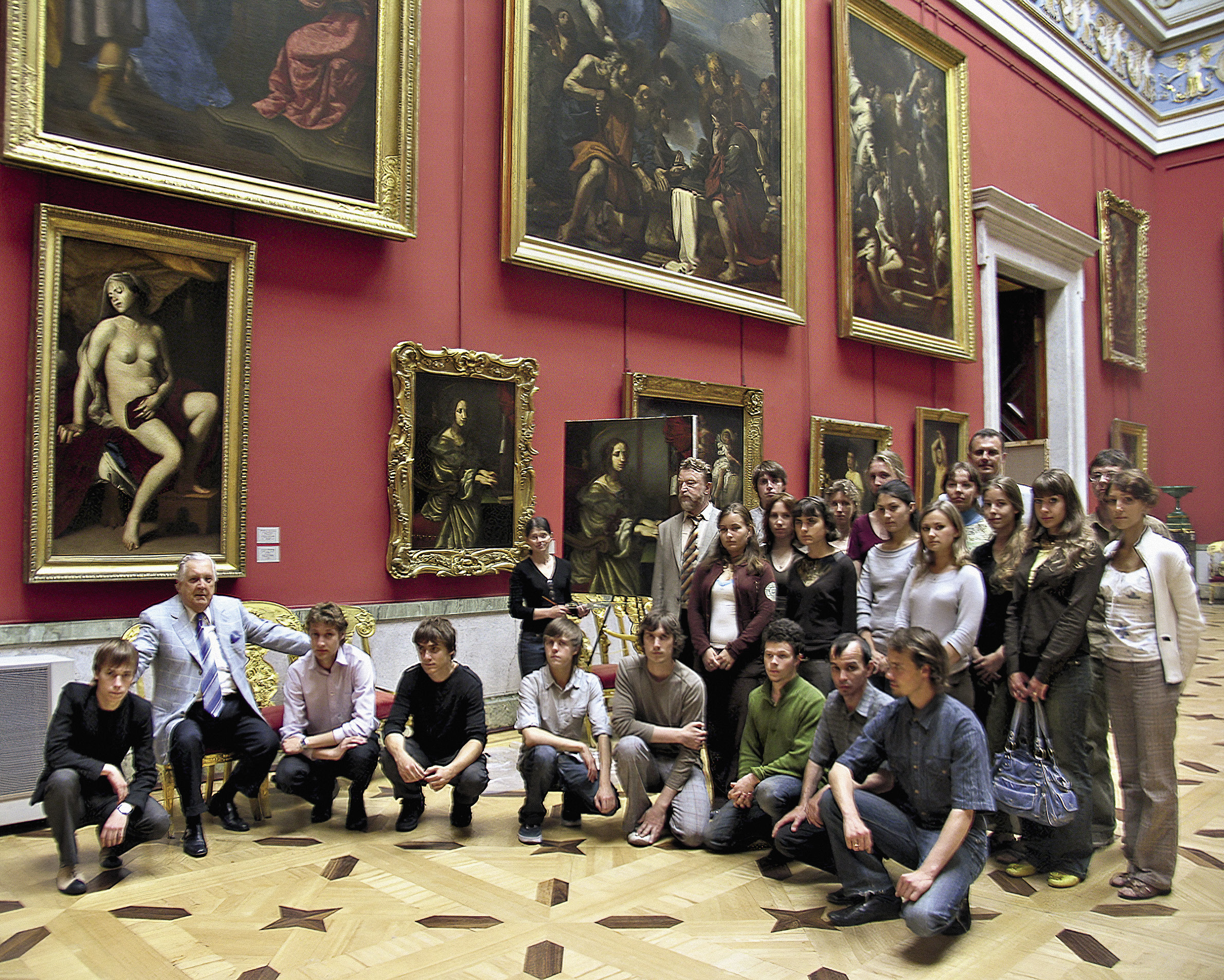 Илья Глазунов с преподавателями и студентами Российской академия живописи, ваяния и зодчества на летней практике в «Эрмитаже».