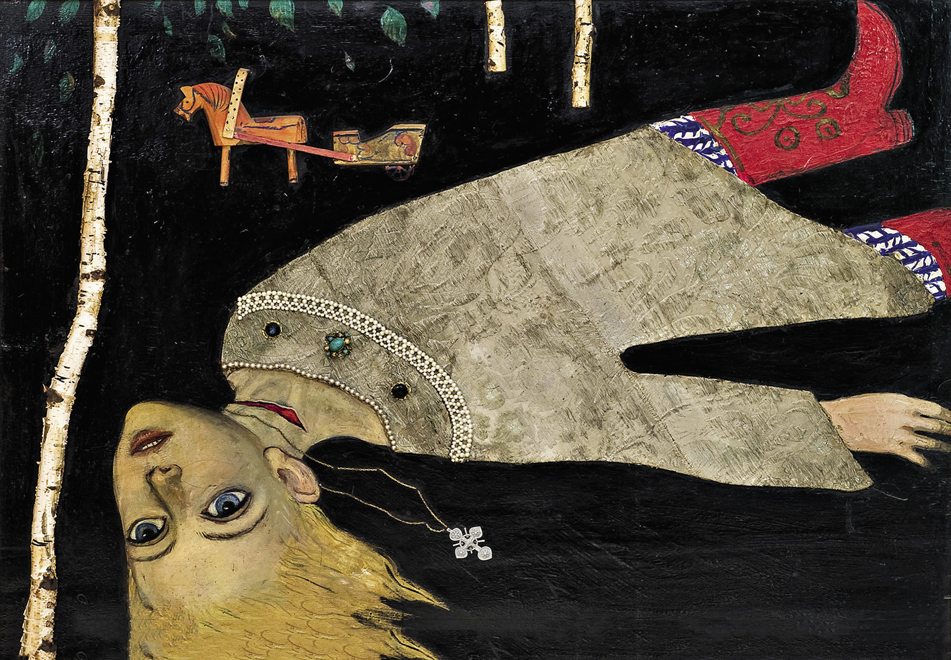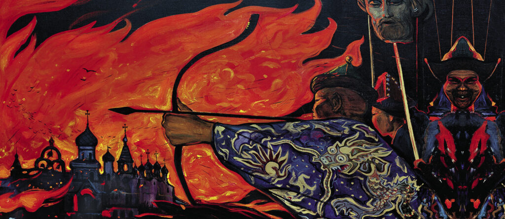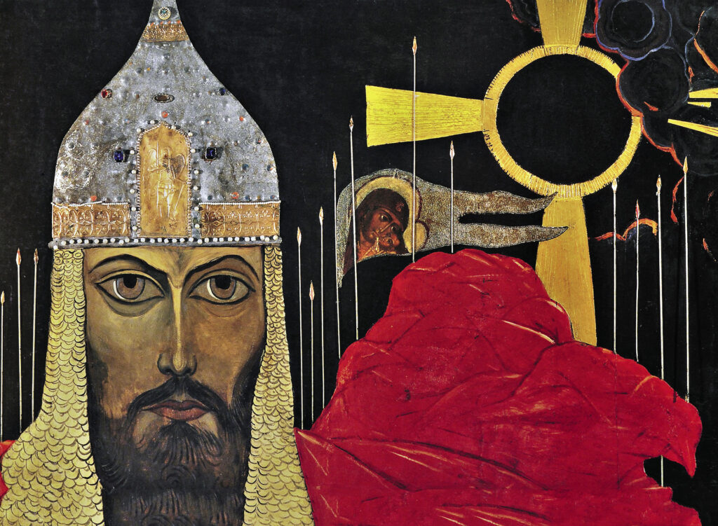 Картина «Князь Игорь» была написана в 1962 году. В правом углу – солнечное затмение, одновременно напоминающее крест. Этот элемент еще можно увидеть на эскизе декорации «Затмение Солнца» к опере А.П. Бородина «Князь Игорь». «Мы исходили из концепции, что князь Игорь – герой, идущий против сил тьмы. Несмотря на зловещее предзнаменование – затмение солнца, он все равно полон неустрашимой отваги и идет на врага», – отмечал художник.