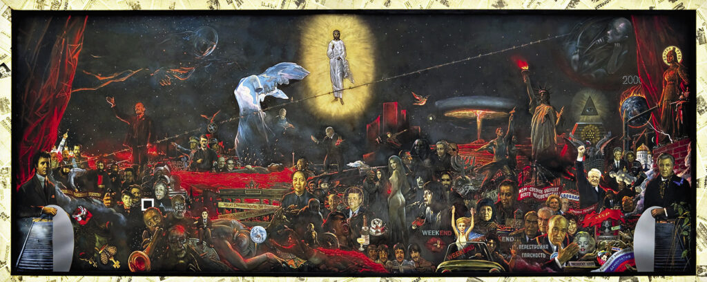 Картина «Рынок нашей демократии», написанная в 1999 году, – это иллюстрация времени правления Бориса Ельцина, когда все покупалось и продавалось. По задумке автора, она должна была повергать зрителя в шок. И если обычно на картинах глаз отдыхает, то это пестрое изображение, похожее на коллаж, на самом деле отталкивает.