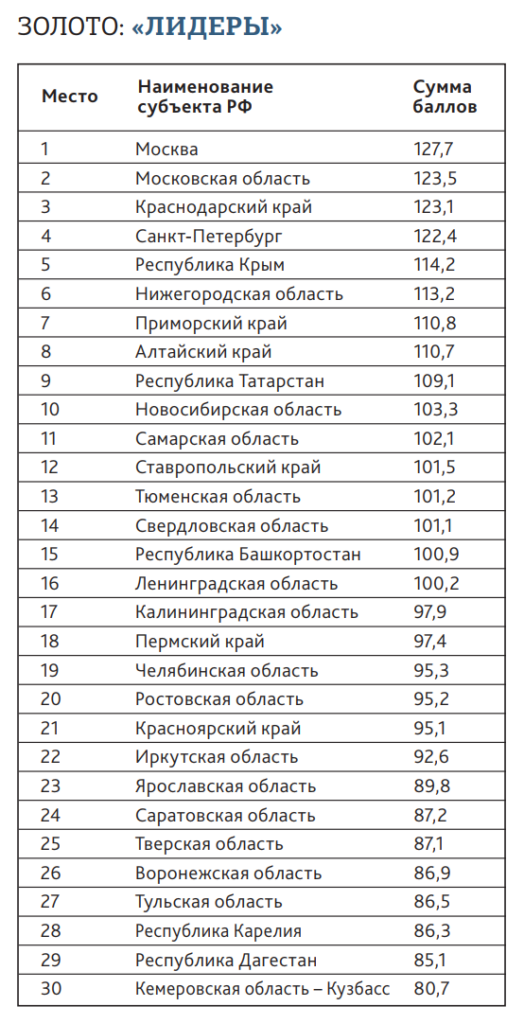 Итак, в первую, «золотую» группу рейтинга под названием «Лидеры» вошли регионы с 1-го по 30-е место включительно.