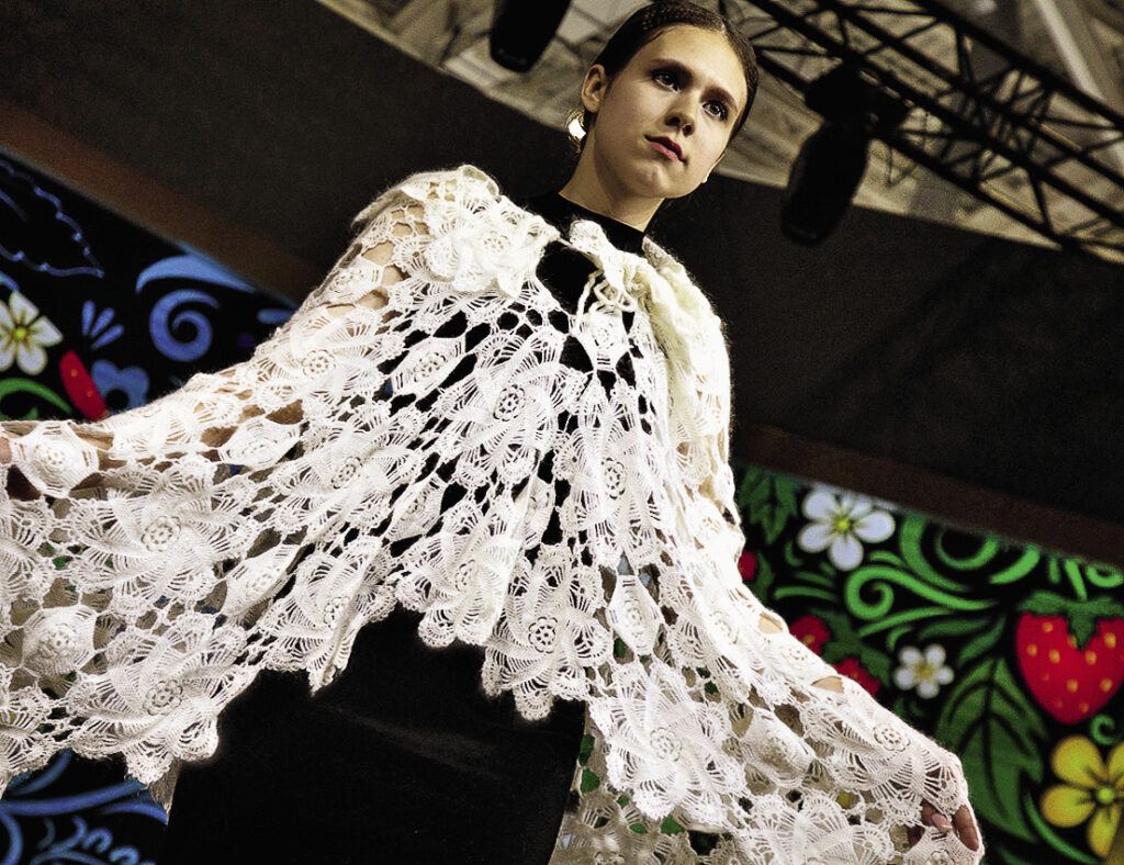 Модель на подиуме демонстрирует пуховый платок во время «Пухового дефиле» – показа коллекции одежды от урюпинских мастеров пуховязального промысла.