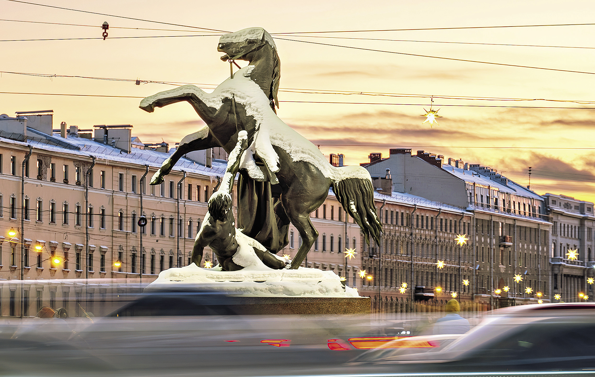 Знаменитая скульптура «Юноша, поверженный конем» на Аничковом мосту и вид на набережную реки Фонтанки СанктПетербурга. Город занимает 4-е место в Национальном туристическом рейтинге.