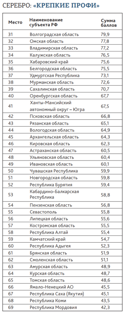 Во вторую, «серебряную» группу рейтинга с названием «Крепкие профи» вошли регионы, занявшие позиции с 31-й по 69-ю включительно.