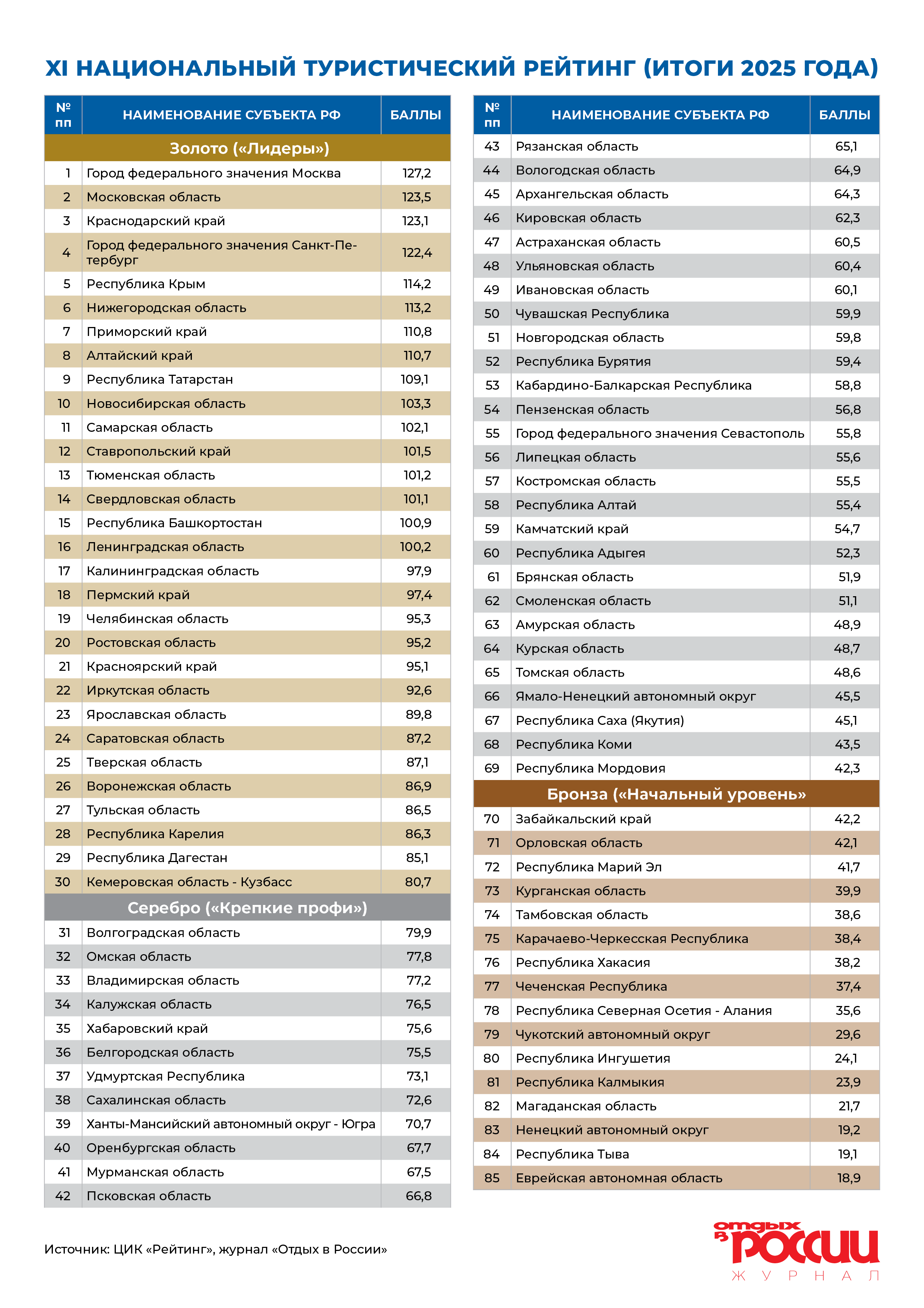 Улучшила свои позиции в рейтинге Республика Татарстан (9-е место), нарастившая туристический поток – по предварительным данным, на 17% по году. По прогнозным данным, по итогам 2025 года республика преодолела планку в 4,5 млн туристов. Объем оказанных услуг в сфере туризма и смежных отраслей достиг 120 млрд рублей, показав рост на 12% (прогнозные данные от Государственного комитета РТ по туризму). Вместе с тем власти отмечают, что все больше людей приезжают в регион и арендуют жилье посуточно в целях экономии.